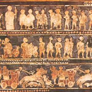 Un des témoins les plus spectaculaires de cette époque reste le cimetière d’Ur, fouillé en 1927-1929, dont les trésors se répartissent aujourd’hui entre les musées de Bagdad, Londres et Philadelphie. Les « tombes royales », comme on les appelle en raison de la richesse des objets qu’elles contenaient, ont soulevé un problème historique dès le moment de leur découverte, car les noms inscrits sur certains objets sont inconnus par ailleurs. Dans certains cas, on a retrouvé la chambre funéraire, dans d’autres seulement la rampe d’accès. Dans la tombe dite « chambre du roi », la quantité de matériel et de cadavres a permis de reconstituer la scène. Sur la rampe menant à la tombe gisaient cinquante-neuf corps, deux chariots et dix-neuf femmes. Dans une autre, le fouilleur releva soixante-quatorze corps. Il s’agit de suicides collectifs et non de massacres, mais ce rite macabre est unique : nul texte n’en fait mention. La richesse du mobilier funéraire est unique également : splendide bijouterie en or et lapis-lazuli, vases d’or et d’argent, harpes, tabliers de jeux, pièces de harnais, armes, sceaux-cylindres. Ces tombes extraordinaires témoignent du haut degré d’inégalité atteint par la société sumérienne au milieu du troisième millénaire.