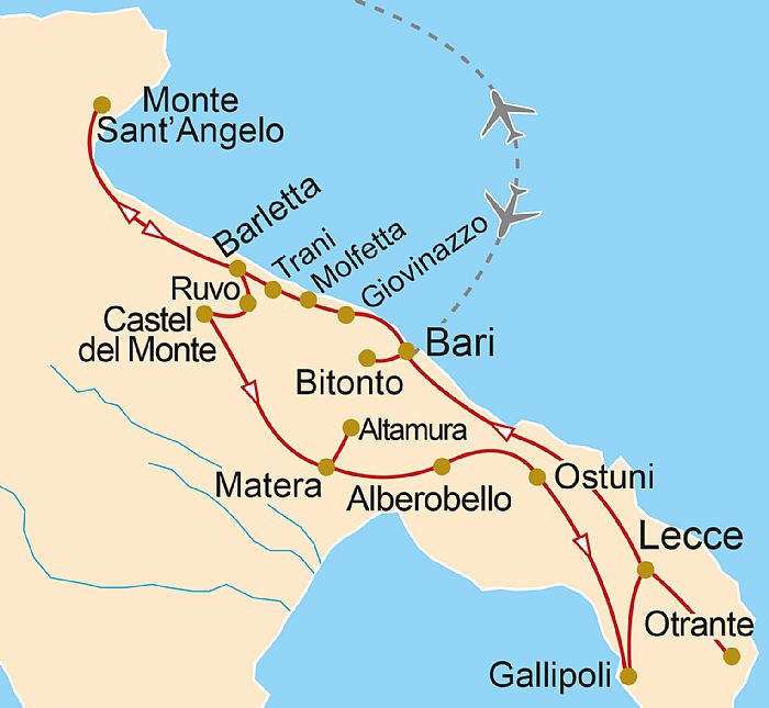 Notre première étape sera pour la capitale de la région. Carrefour commercial et culturel, tourné vers la mer et l'Orient grâce à son port, l'un des plus importants de l'Adriatique, Bari a connu les splendeurs de la Grande Grèce et celles de la Rome Antique, avant de voir défiler, siècle après siècle, les Sarrasins, les Byzantins, les Normands, les Souabes, les Angevins et les Aragonais.